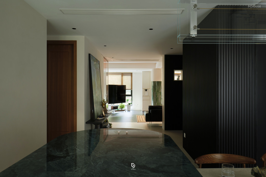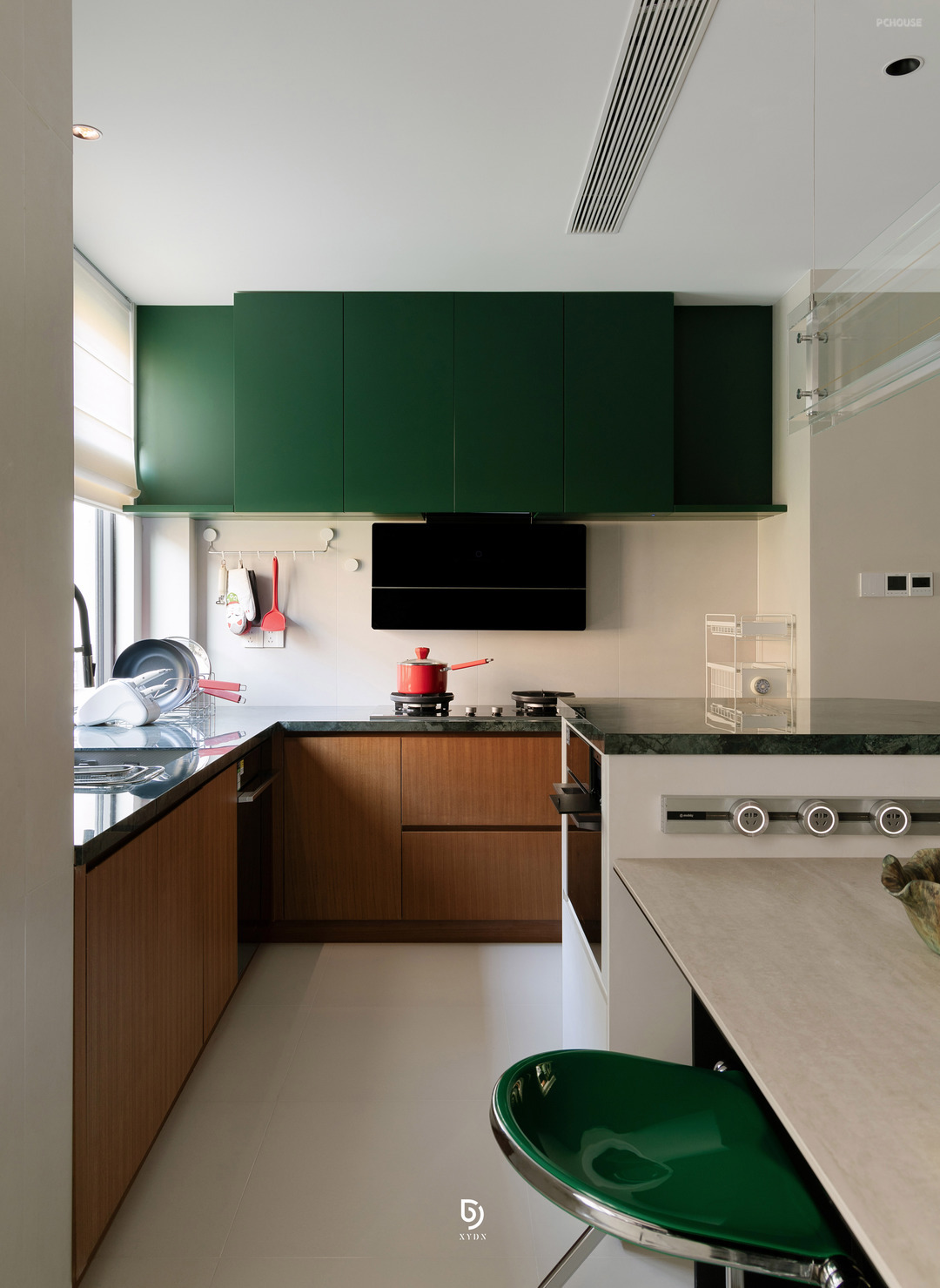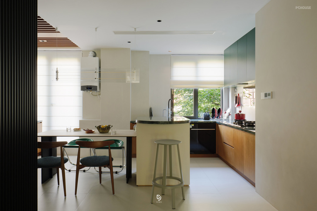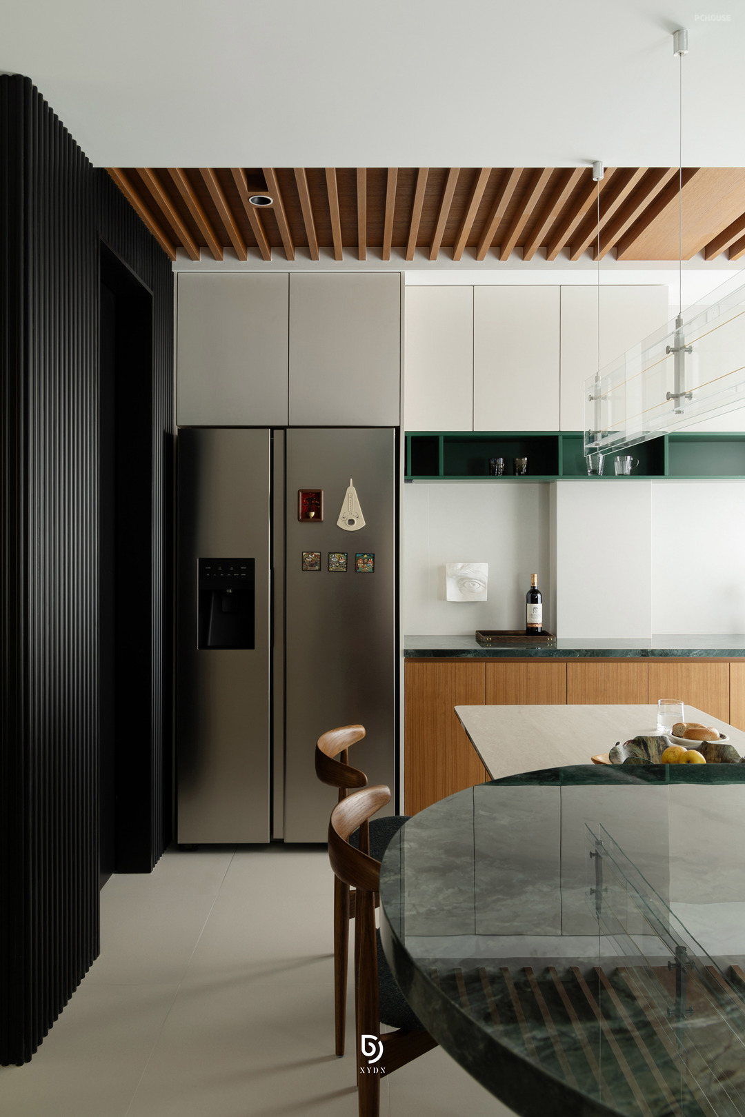 1.打通一个房间进行餐厨一体化设计,空间得到扩展,水吧、岛台、烹饪、用餐等区域进行了细致划分。
